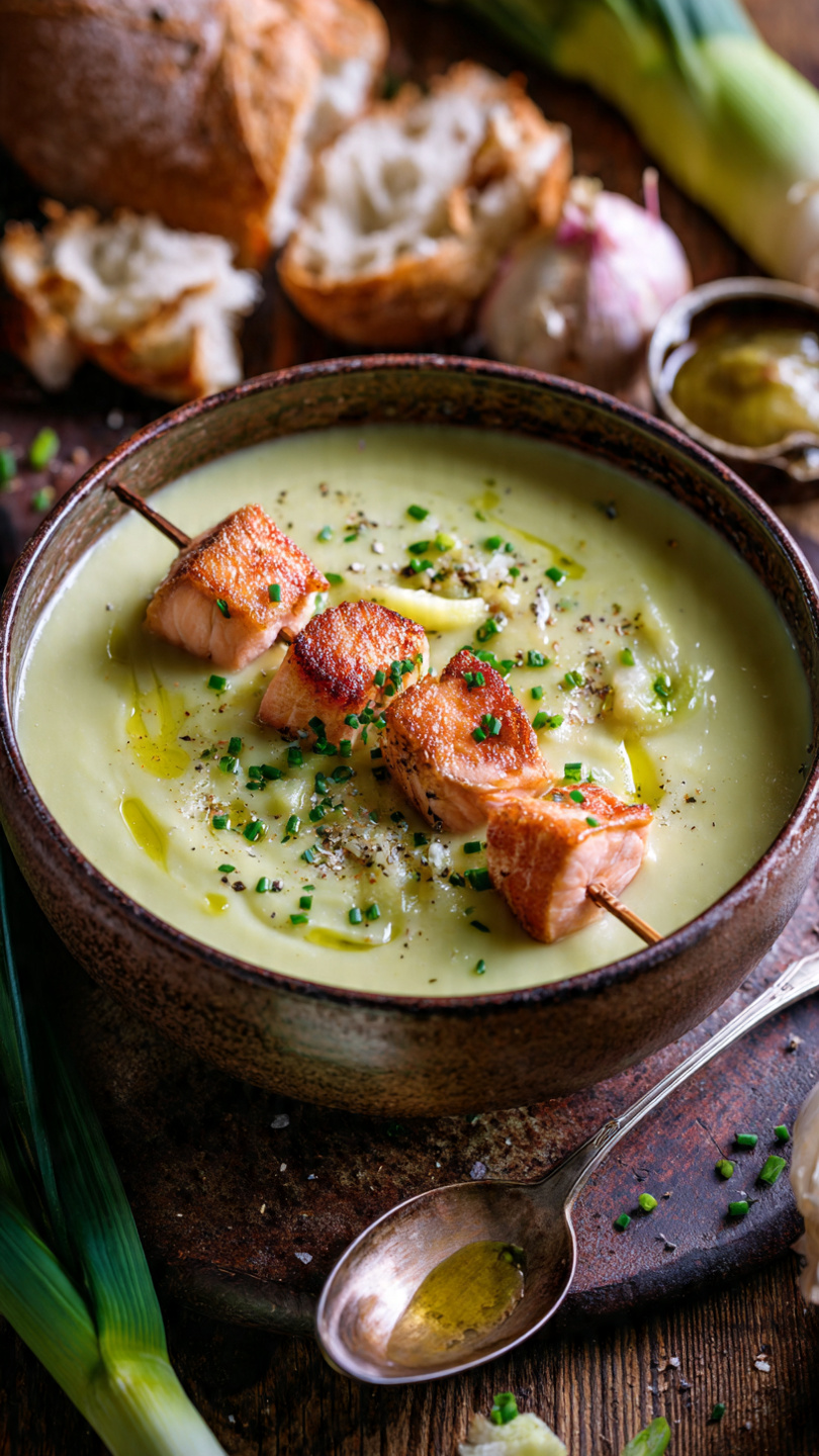 🥄 Crema di Porri e Patate con Spiedino di Salmone: un Elegante Primo Piatto Cremoso e Profumato