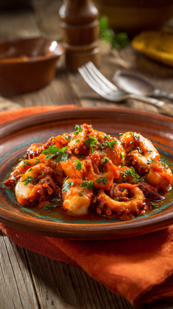I piccoli polpi vengono cotti lentamente in un profumato sugo di pomodoro con aglio, prezzemolo e un pizzico di peperoncino, fino a diventare teneri e avvolti da una salsa densa e saporita.