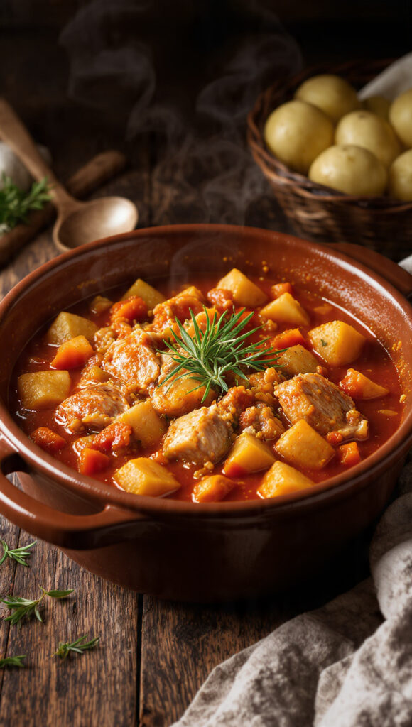 Copri con il coperchio e cuoci a fuoco dolce per 45–50 minuti, finché carne e patate saranno morbide e la salsa densa e saporita.