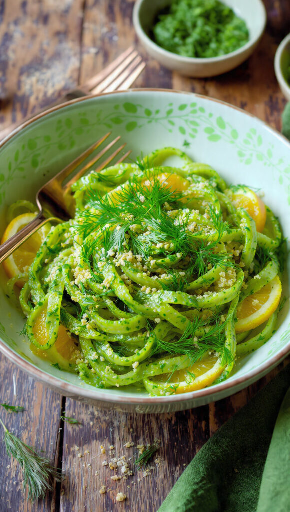 Un primo piatto elegante, aromatico e sorprendente: le linguine al pesto di aneto e agrumi conquistano con il loro profumo fresco e la nota dolce-acidula delle arance e dei limoni.