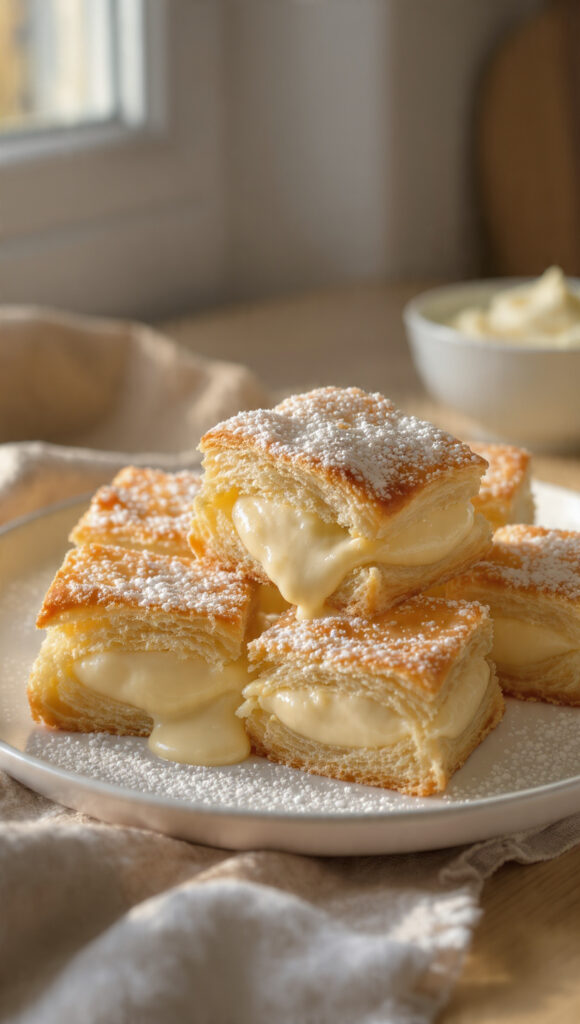 Gli Sporcamuss (o Sporcamusi) sono piccoli tesori della pasticceria pugliese: quadratini di pasta sfoglia gonfia e croccante, ripieni di crema pasticcera e spolverati di zucchero a velo. Il loro nome simpatico nasce dal fatto che, al primo morso, è impossibile non… sporcarsi il muso!