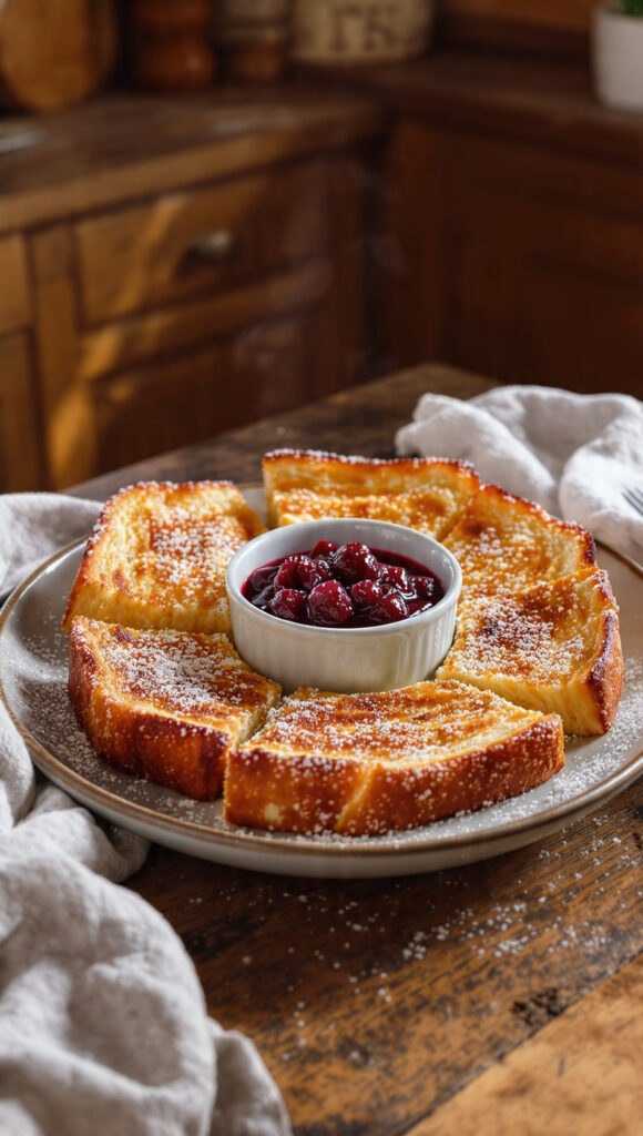 Disponi il pain perdu nei piatti, spolvera con zucchero a velo e accompagna con confettura, miele o frutta fresca.