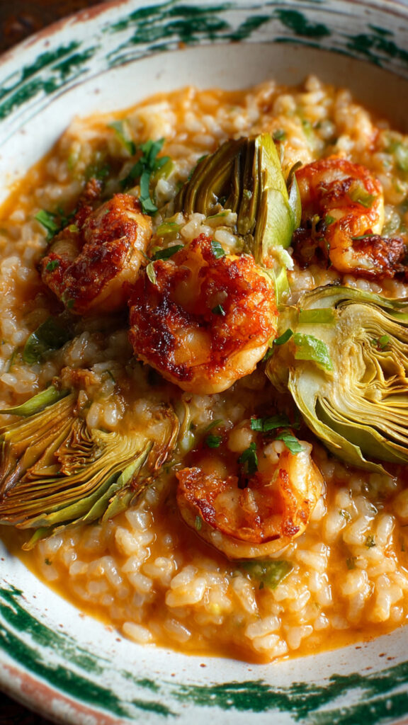 • 🍤🌿 Risotto con Gamberi, Bisque Veloce e Carciofi Fritti – Eleganza di Mare in Tavola