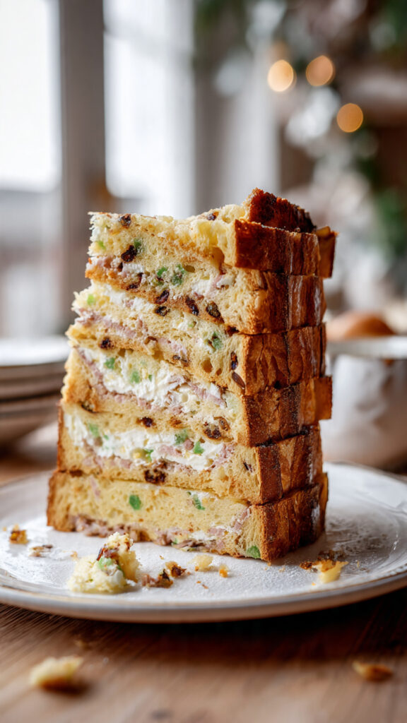 1️⃣ Taglia il panettone gastronomico in 5–6 dischi orizzontali di uguale spessore.