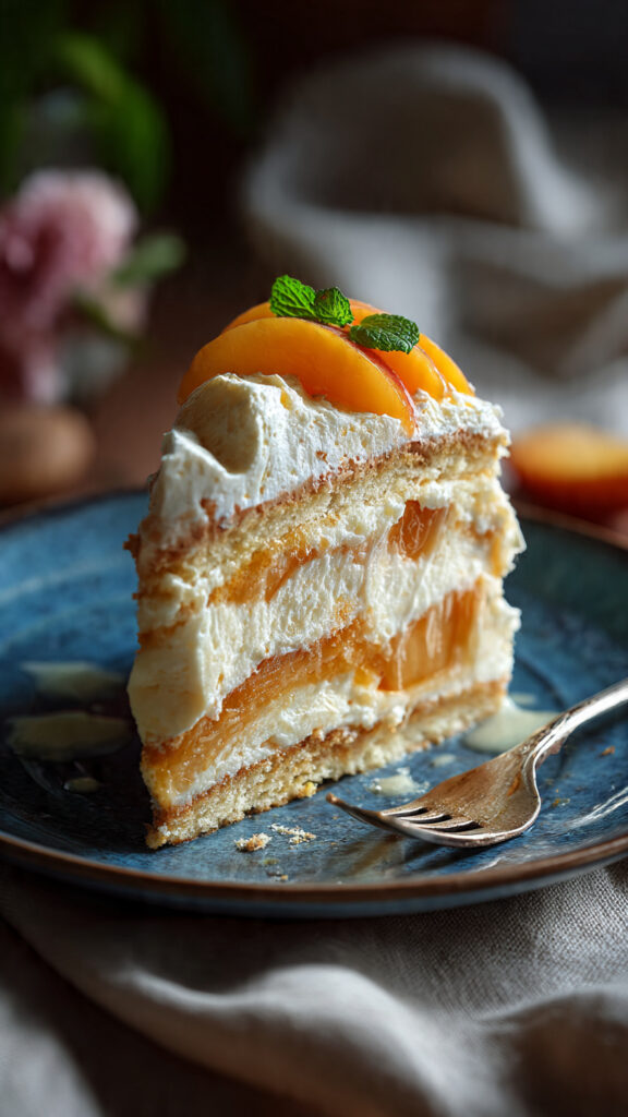 4️⃣ Copri con uno strato di crema, poi distribuisci una parte delle pesche.