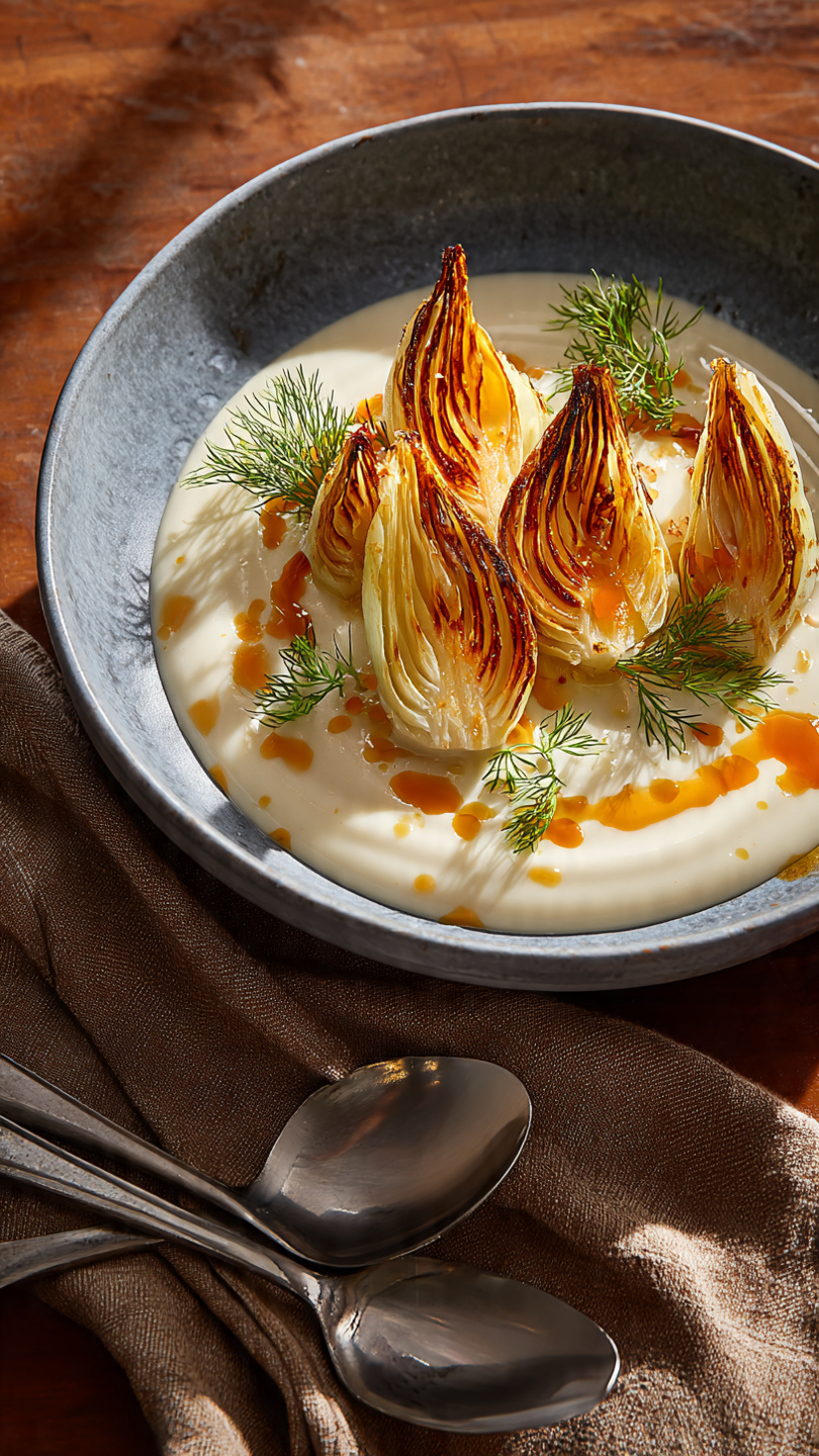 🌿🥣 Finocchi Brasati su Crema di Cannellini – Un Piatto Elegante, Leggero e di Stagione