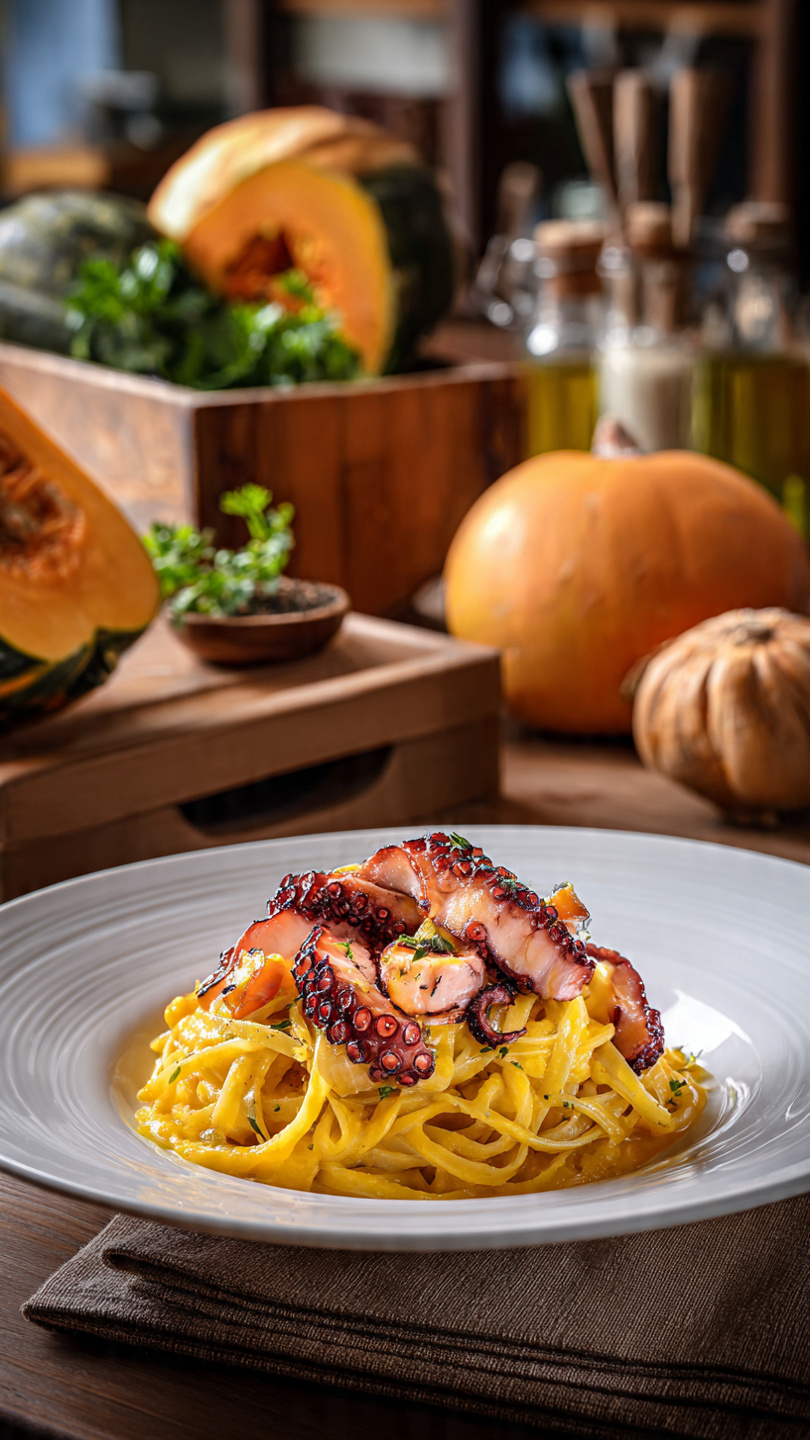 🎃🐙 Pasta con Crema di Zucca e Polpo – Un Primo Piatto Cremoso, Elegante e Ricco di Mare