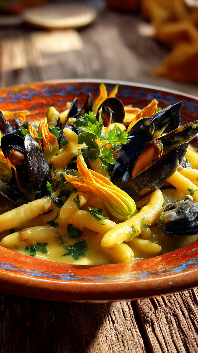 🟡 Cavatelli ai Fiori di Zucca, Cozze e Zafferano: un Primo Profumato dal Gusto di Mare