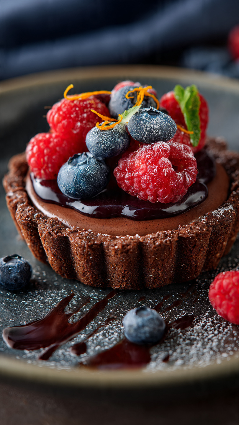 🍊 Crostata al Cacao con Curd di Agrumi e Coulis di Frutti di Bosco: un Dessert Raffinato dal Gusto Equilibrato