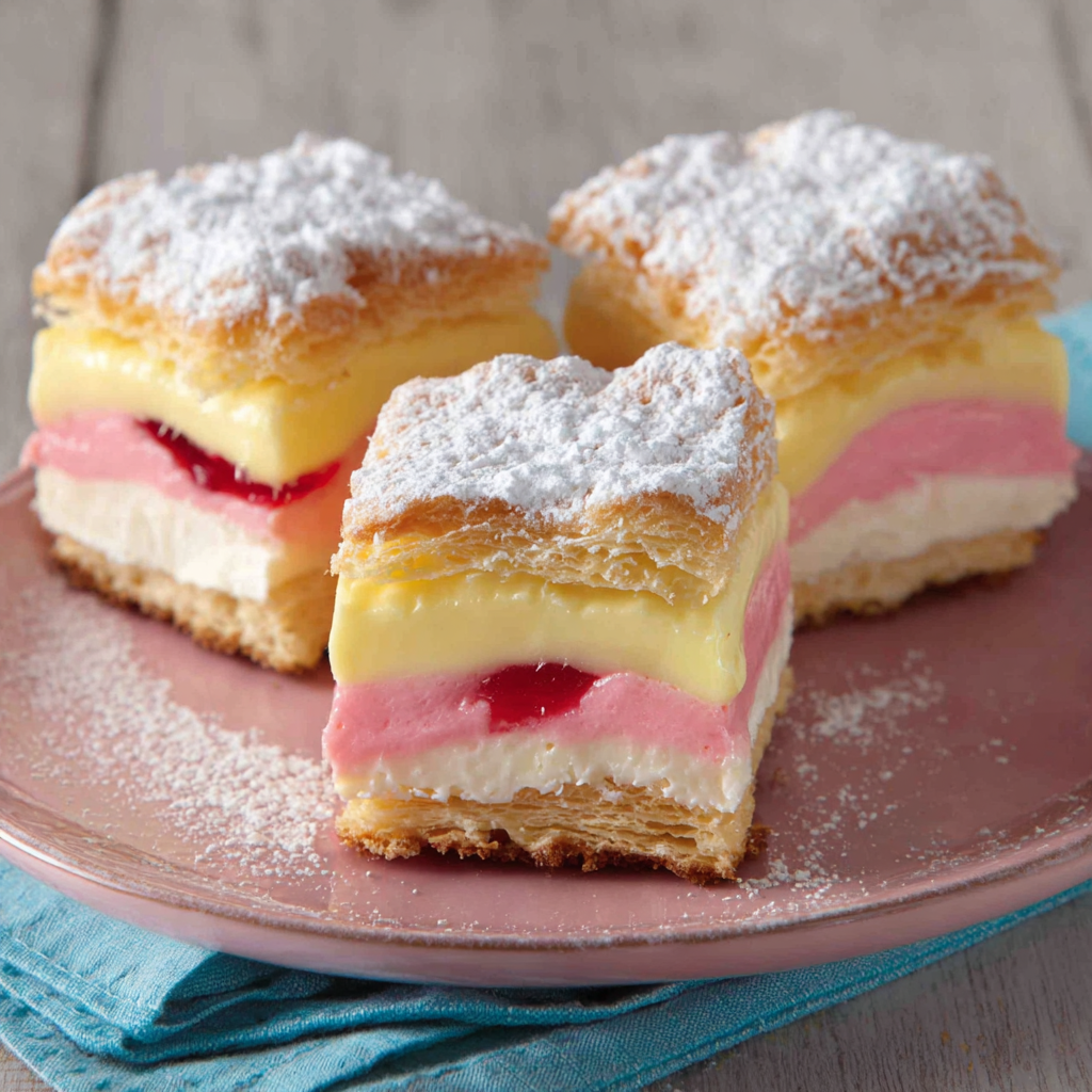 Piccoli scrigni dolci, dove ogni morso racchiude la fusione tra la croccantezza della pasta sfoglia, la morbidezza del pan di Spagna imbevuto e la leggerezza della crema diplomatica. Perfetti in versione mignon per buffet, feste, o da servire come eleganti monoporzioni. 📋 Info Ricetta 🧁 Ingredienti Per il Pan di Spagna Per la crema diplomatica…