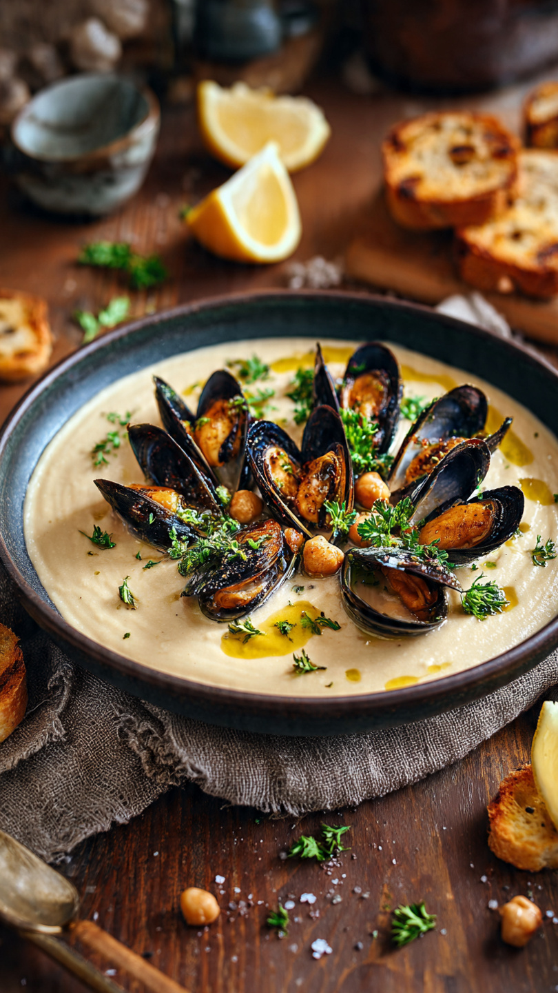 🧡🐚 Vellutata di Ceci con Sauté di Cozze e Vongole: Eleganza Marina in un Primo Morbido e Profumato